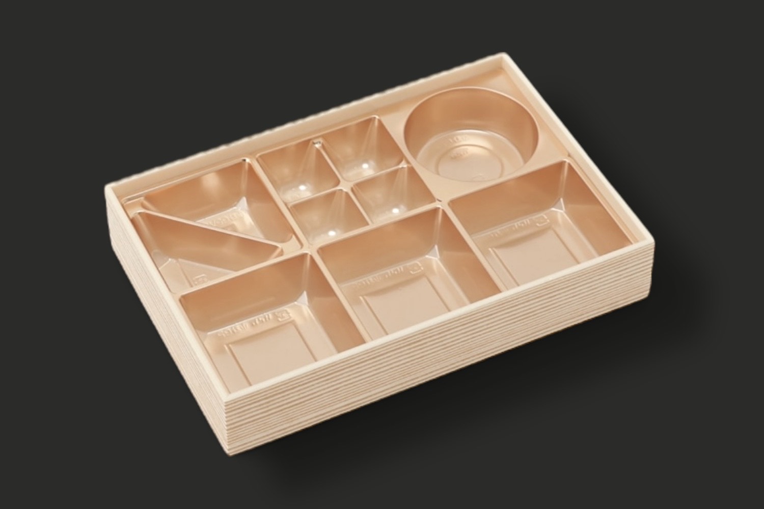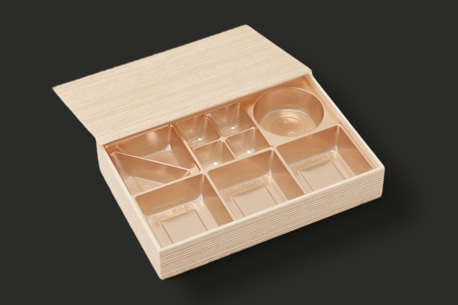【長方形1段 木目柄265折 しゃくり蓋・小鉢65X6個付 22入】